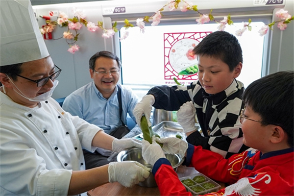 4月2日,旅客在糕點(diǎn)師傅的幫助下體驗制作青團。