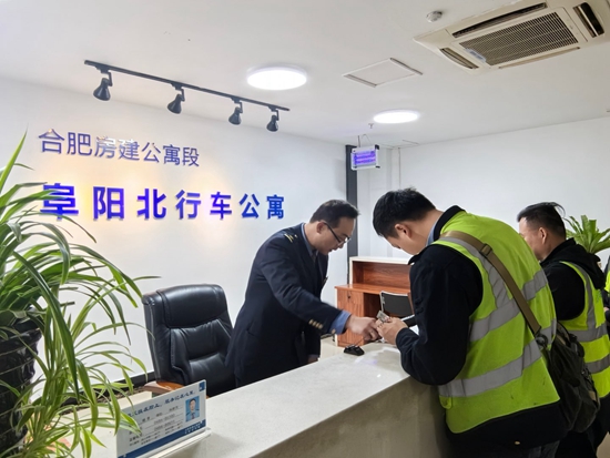 “您好,歡迎入住阜陽(yáng)北行車(chē)公寓,請出示有效證件,并錄入指紋辦理入寓手續?!?月14日20時(shí),合肥房建公寓段叫班員楊李正在服務(wù)...