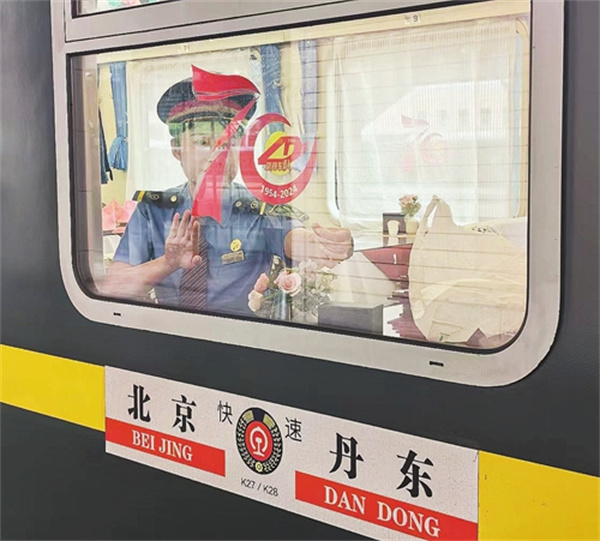 北京至丹東K27/28次列車(chē)迎來(lái)70周年,列車(chē)長(cháng)李思文把慶祝70周年紀念貼裝飾在車(chē)窗上...